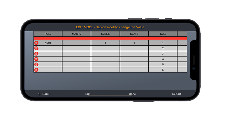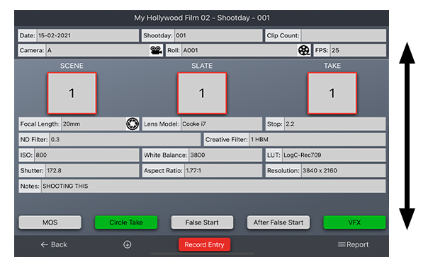 The scrollable slate screen contains fields to log information. It is designed to show all the information for each shot at a glance. For quick entry double tap just outside the slate box to increase the slate number which also resets the take number to 1. Double tap near the take box to add one to the take. Once happy with the entry hit the Record Button (which also then adds one to the take). Tag your shots with various options like Circle Take or VFX.