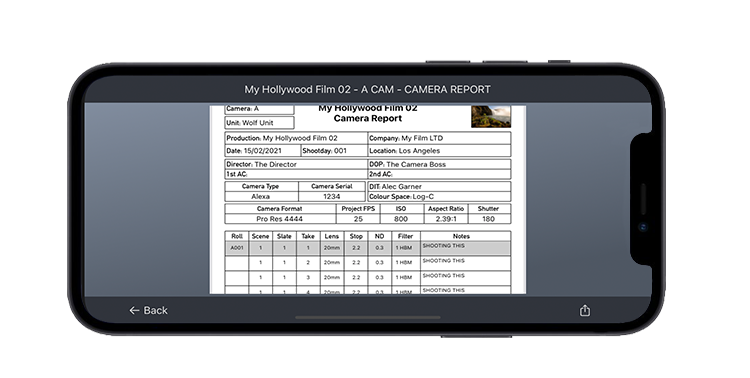 Enter Camera Sheets, enabling quick and easy scene, slate, take and other information to be logged. Reports can be generated in PDF and CSV formats and distributed to your chosen contacts.